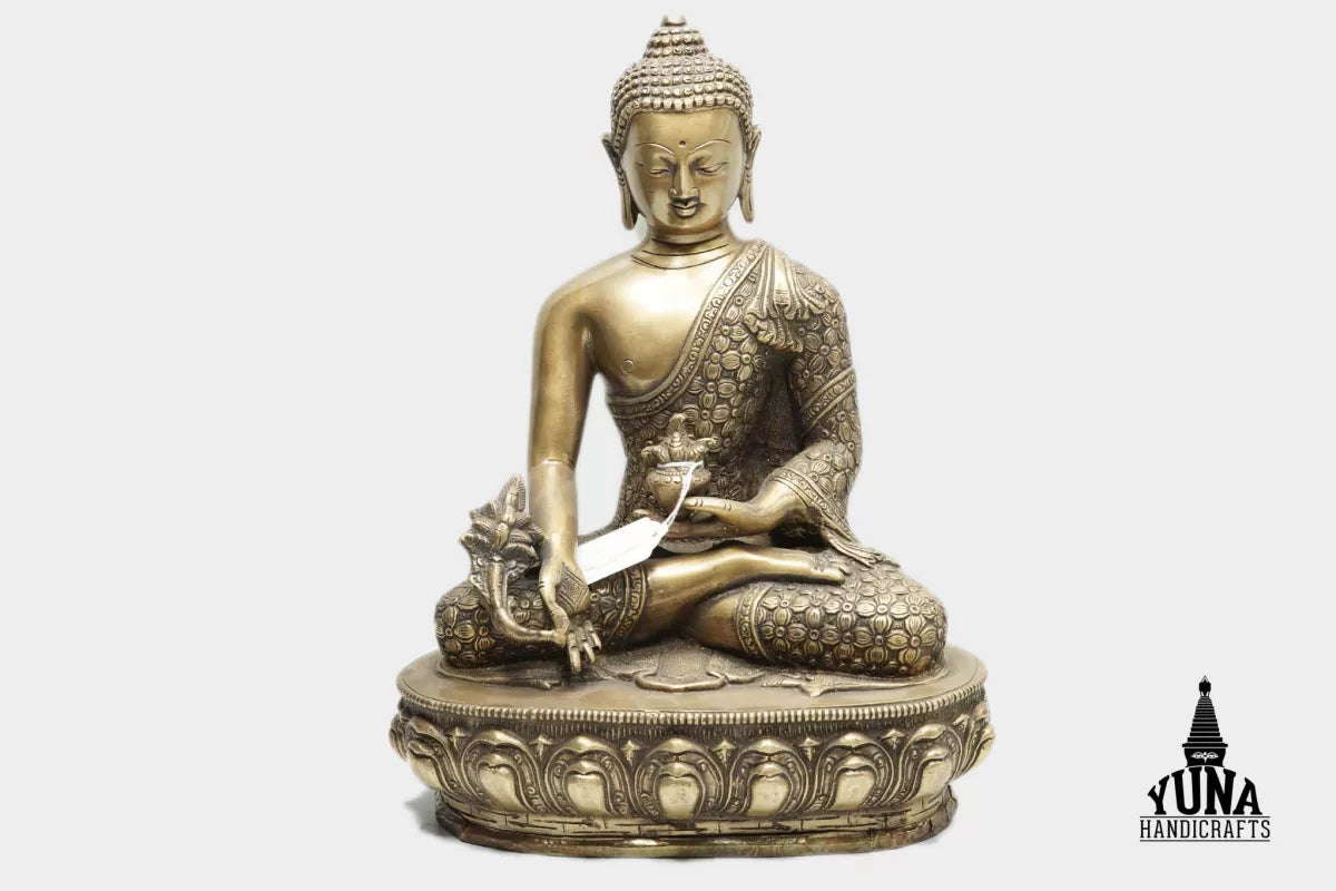 Medicine Buddha is depicted sitting with the right hand facing downward, palm outward, and holding a bowl of herbs in the left hand. Known for medicinal knowledge, it is ideal for those seeking good health, often represented by blue skin.