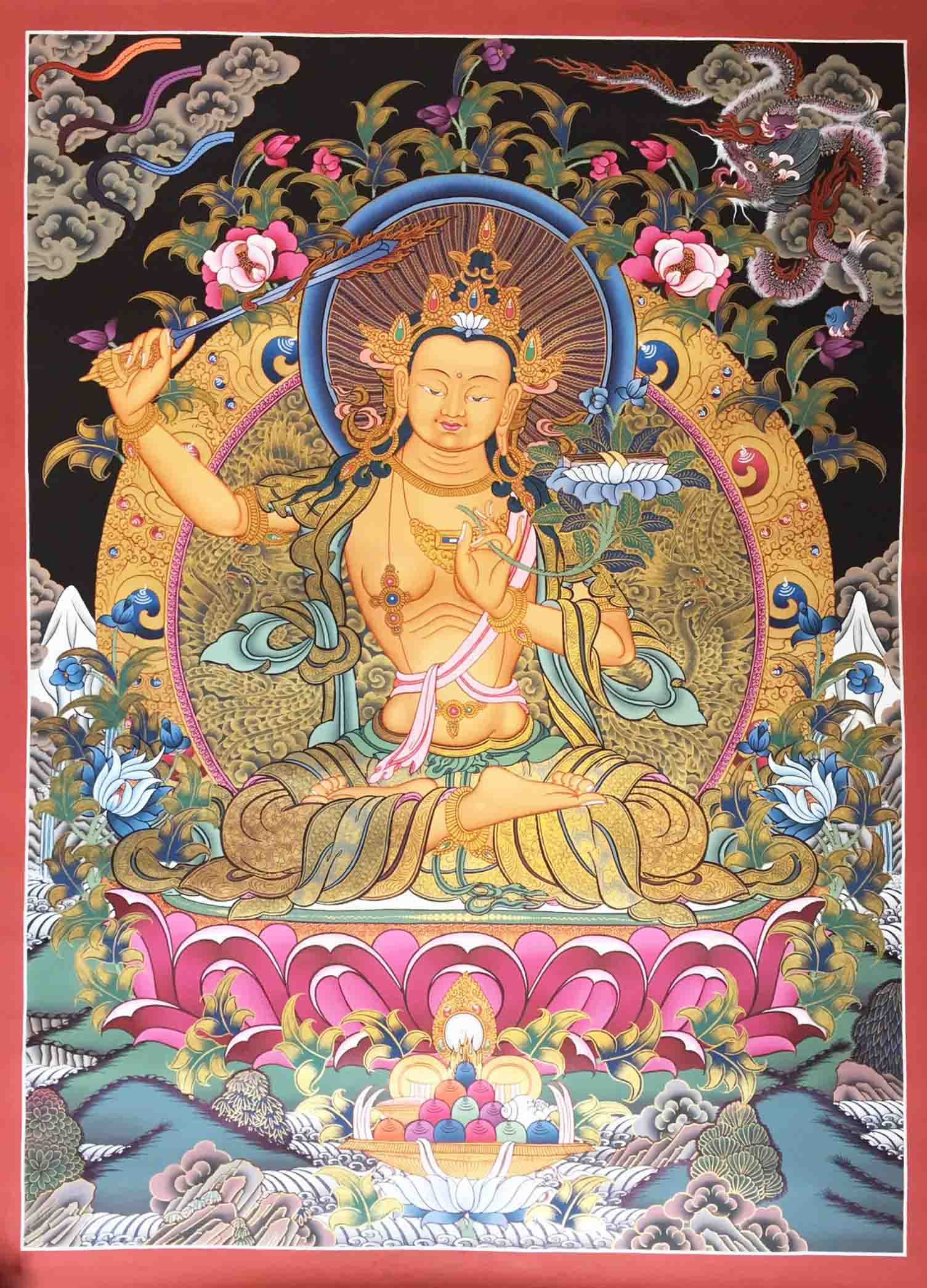 The Manjushri Thangka Painting is a beautifully crafted piece that captures the essence of the Bodhisattva of Wisdom, Manjushri, one of the most revered figures in Buddhist tradition. This Thangka, hand-painted by skilled Tibetan artisans, is a vibrant and detailed representation of Manjushri, symbolizing wisdom, clarity, and spiritual insight.
